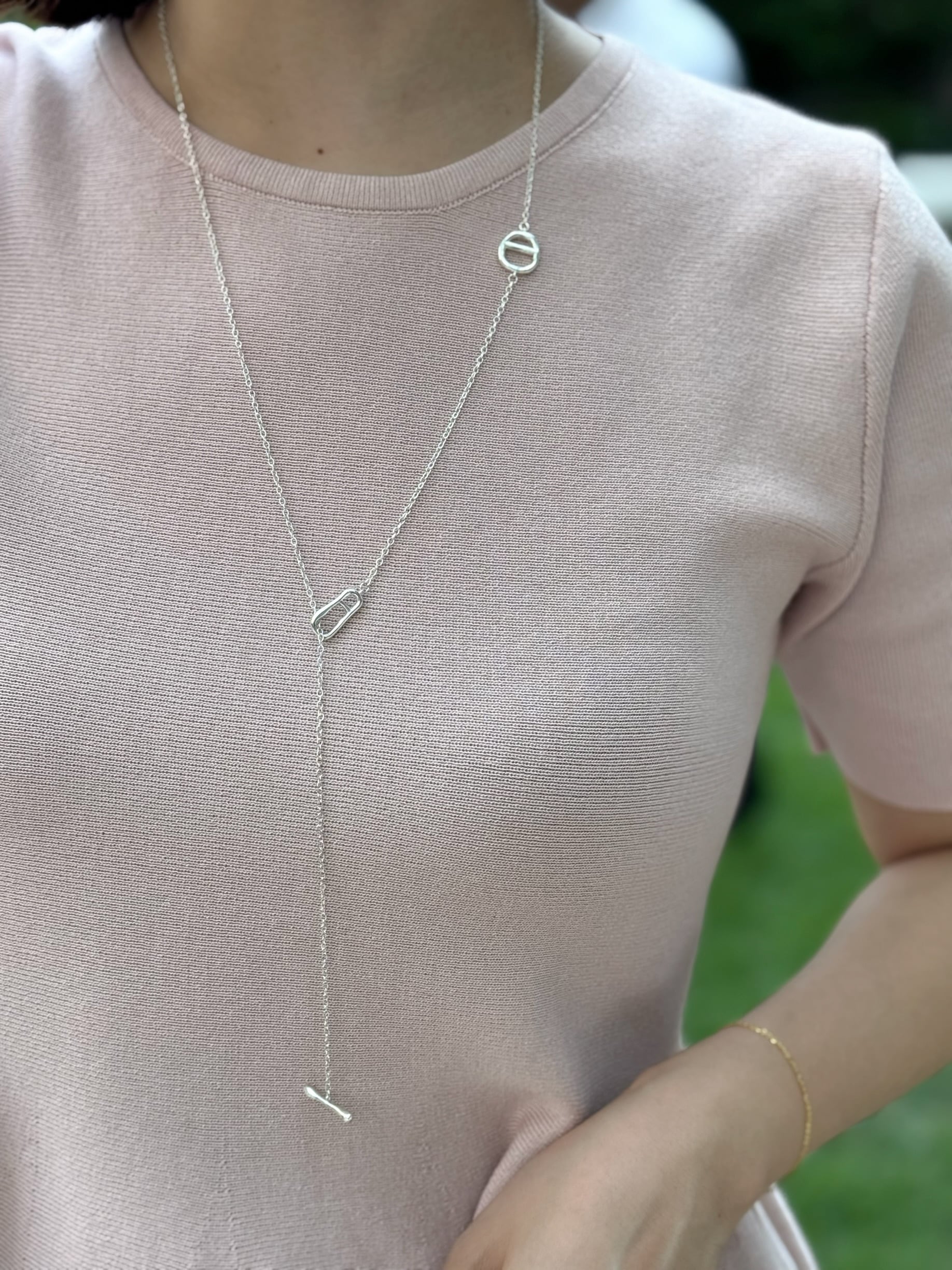 ニュアンスパーツが洗練された印象を醸し出す、オトナなロングネックレス 組合せ次第でいろんな使い方が可能です