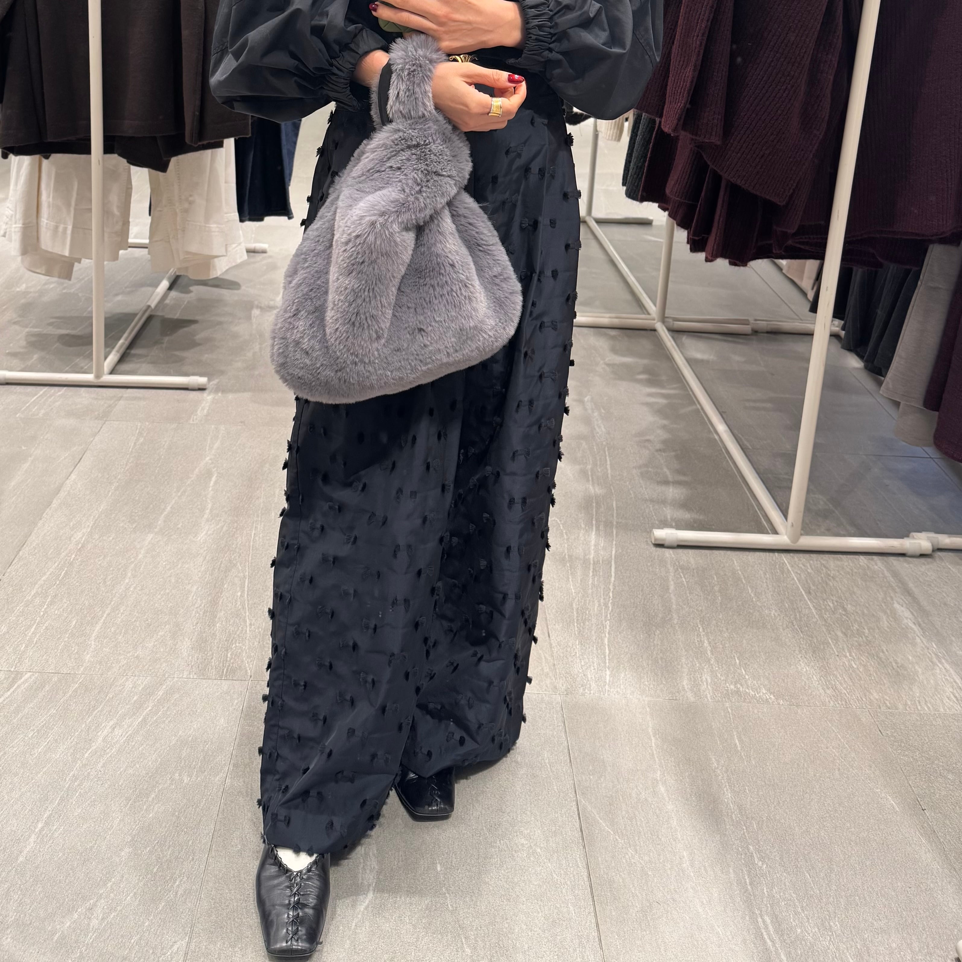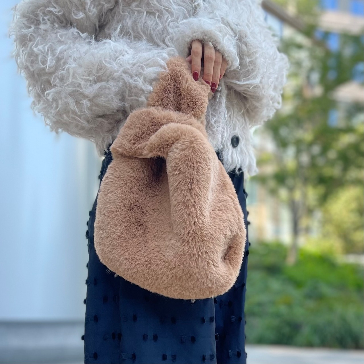 柔らかな丸みを帯びたシルエットで使い勝手の良さとファッション性を両立しています。手に持ったときのフォルムがとても愛らしく、どんなシーンでも華やかな印象を与えてくれるアイテムです。