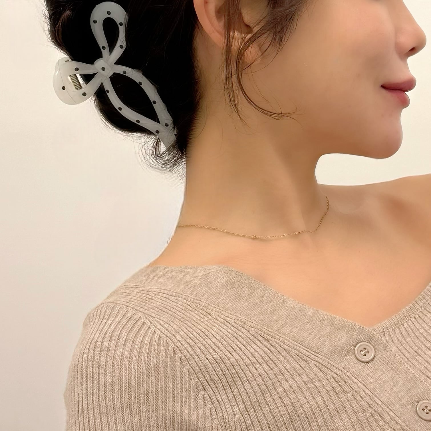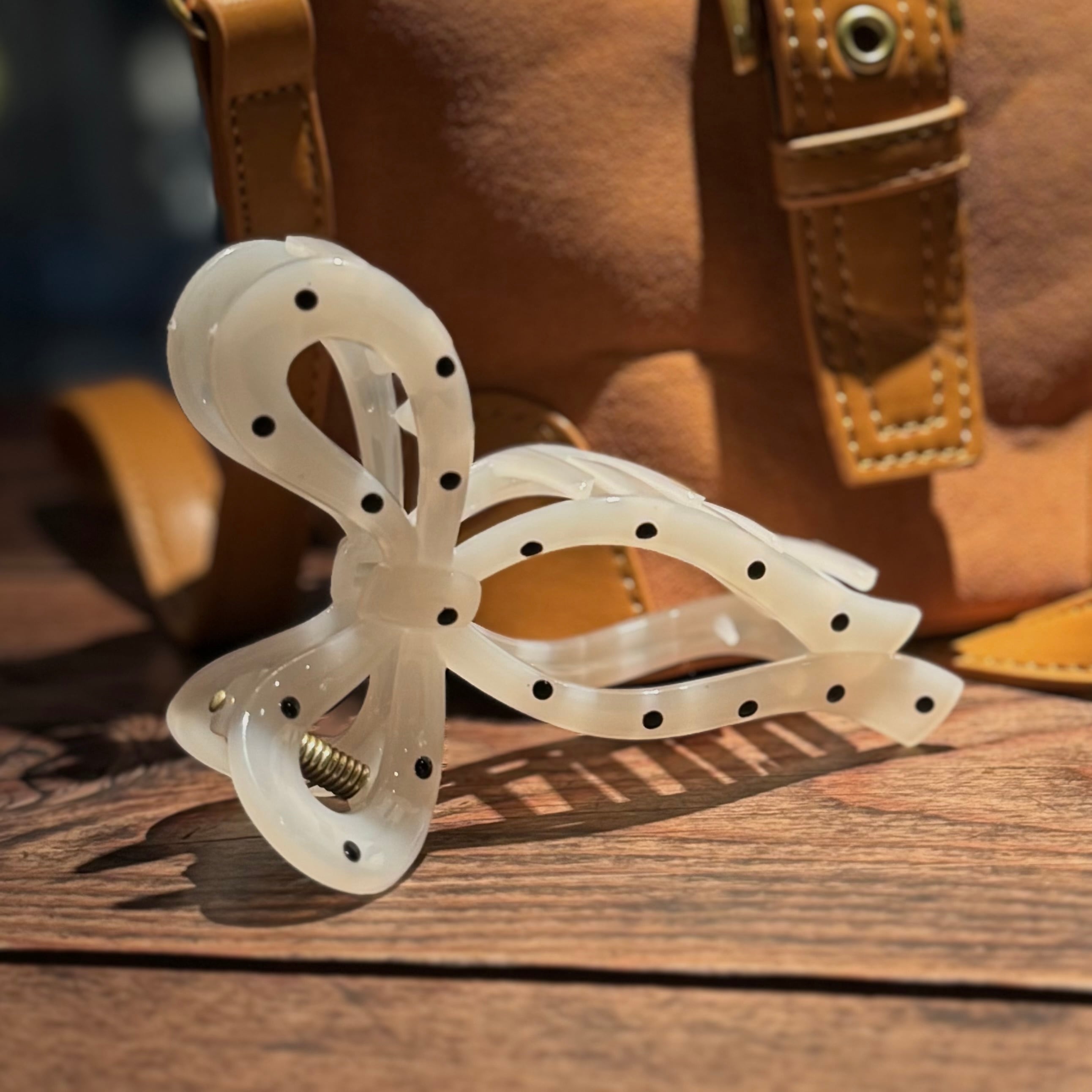 水玉柄のリボンが特徴バレッタ。大きめのサイズ感は、髪が長い方でもしっかりと全体をまとめることができ、オトナ可愛い印象を演出します。