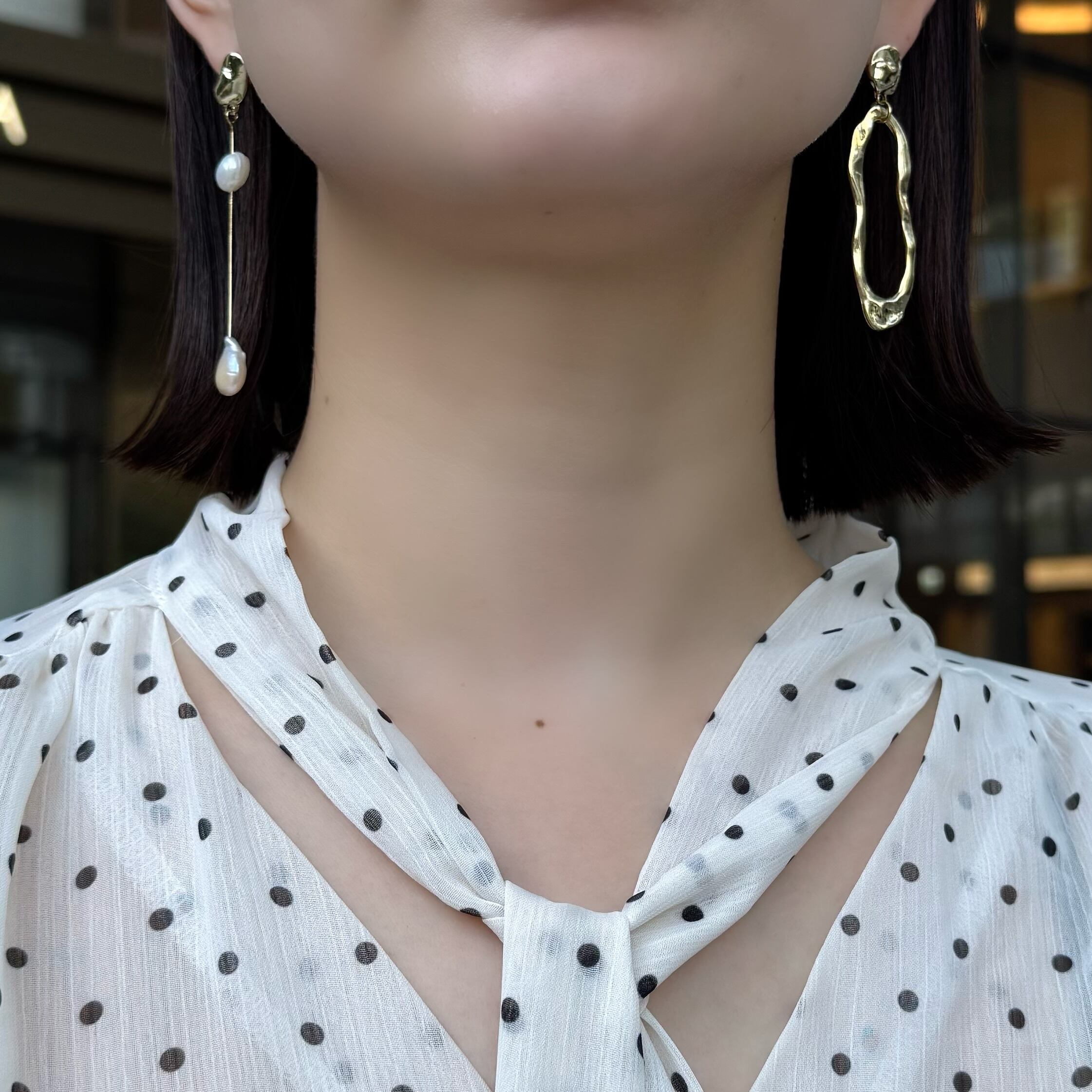 アシンメトリーで異なるシルエットの組み合わせによって、上品さの中にアートな遊び心を感じるピアスです。片側にはゴールドフレーム、もう片側には淡水パールが揺れ動き、動くたびに印象的なアクセントを生み出します。