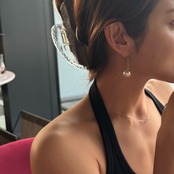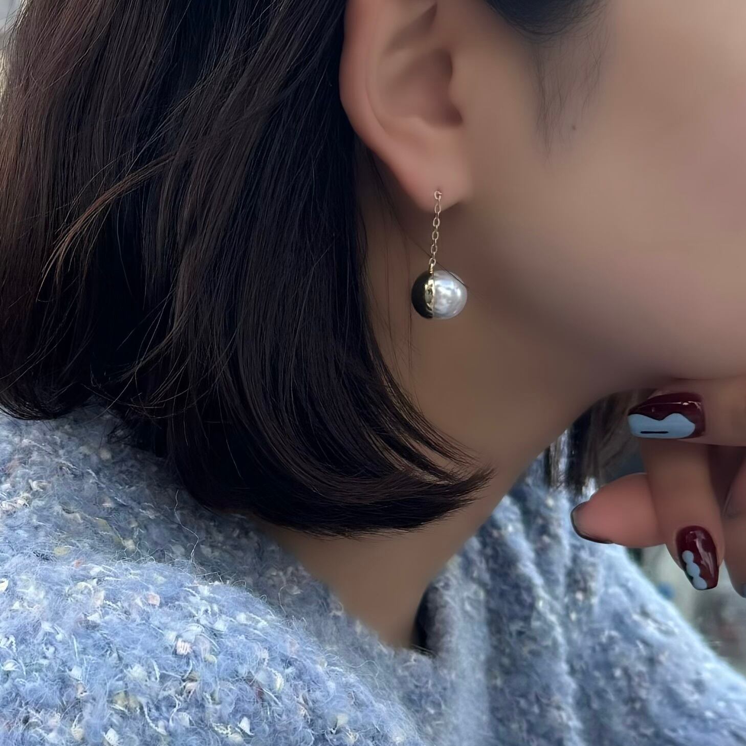 ゴールドとパールがハーフで球状になった珍しいデザインのピアス